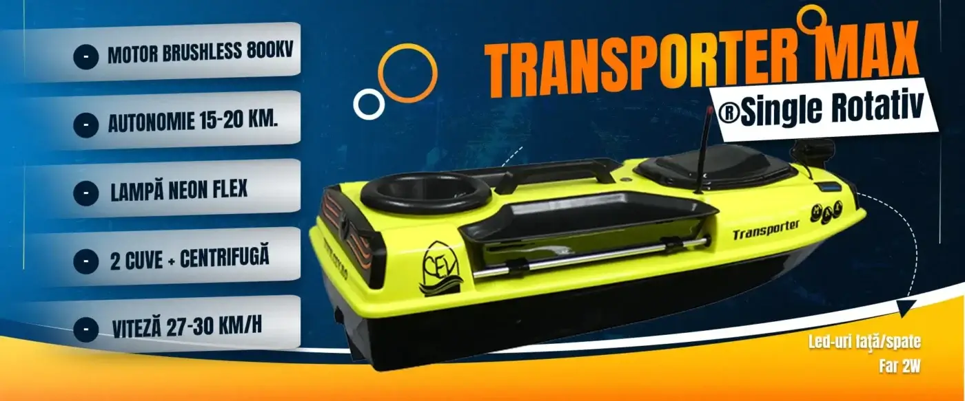 Descoperă Transporter Max, cel mai recent navomodel plantat, creat pentru a duce pescuitul la un nou nivel. Mai puternic, acest navomodel plantat este dotat cu un motor robust ce asigură o viteză mai mare și o manevrabilitate excelentă chiar și în condiții dificile. Mai rapid, îți permite să ajungi rapid în zonele de pescuit de unde poți lansa nada cu precizie, economisind timp și resurse. În plus, mai eficient, navomodelul de plantat Transporter Max maximizează fiecare sesiune de pescuit prin tehnologia avansată de plantare a nadei, garantând o distribuire exactă și controlată, chiar și în locuri greu accesibile. Fiecare detaliu a fost conceput pentru a oferi o experiență modernă, fiabilă și de neuitat pentru toți pescarii pasionați.